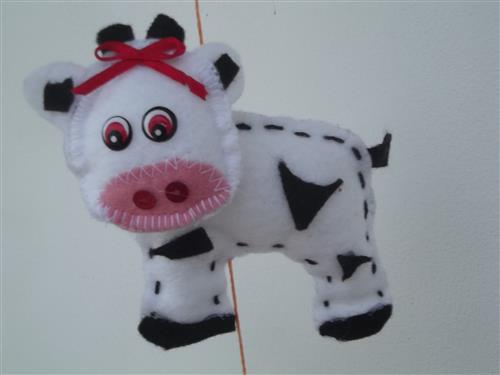 Mobile composto por 3 lindas vacas com um lancinho vermelho, feitos de feltro nas cores branco e rosa.